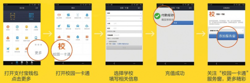 日前,我院已正式开通“支付宝”校园一卡通充值服务,广大师生可以在“支付宝”账户里通过选择院校、输入学工号、姓名、充值金额等信息即可为一卡通充值。