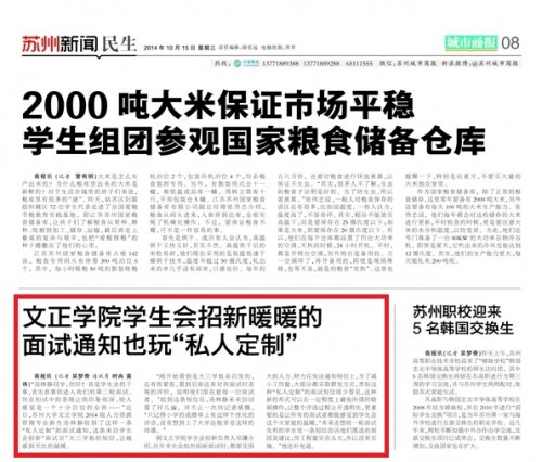 商报讯(记者 吴梦奇 通讯员 时冉 莫诗)“汤林静同学,你好!我是学生会的干事,首先恭喜你进入我们的第二轮面试。你在初试中的表现让我印象很深,给人感觉是一个十分自信的女孩……”近日,苏州大学文正学院2014级人力资源管理专业新生汤林静收到了这样一条“私人定制”的面试通知,这条来自学生会招新“面试官”大三学姐的短信,让她感到无比的温暖。