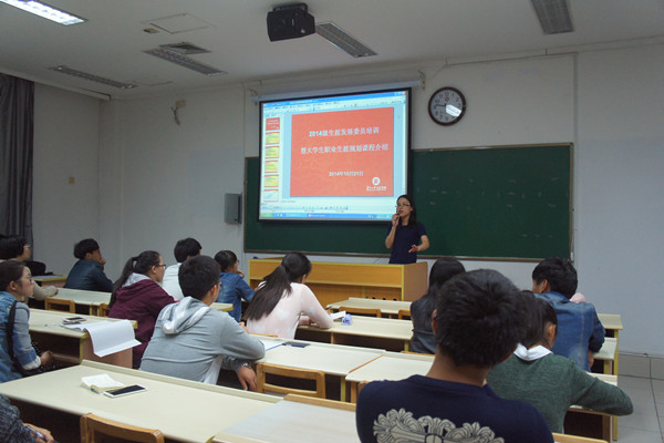 (高惠 曹一石/文 高惠/图)10月21日下午4点,由我院就业处职业发展辅导中心主办的“2014级生涯发展委员培训暨大学生职业生涯规划课程介绍”在我院1-103教室举行。