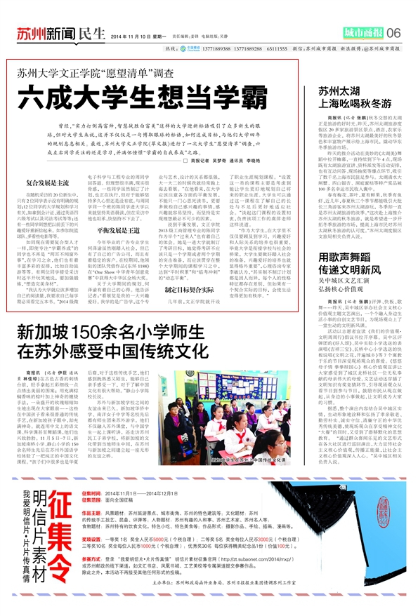 曾经,“实力打倒高富帅,智慧战胜白富美”这样的大学迎新标语吸引了众多新生的眼球,但对大学生来说,这并不仅仅是一句博取眼球的标语,如何达成目标,与他们大学四年的规划息息相关。最近,苏州大学文正学院《翠文报》进行了一次大学生“愿望清单”调查,六成左右同学关注的还是学习,并满怀憧憬“学霸的自我养成”之路。