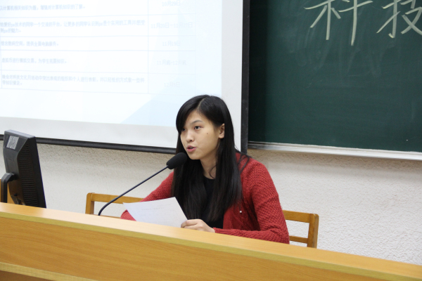 学生科技协会外联部部长马樱向大家介绍了2014年我院科技文化月的整体安排,科研竞赛服务中心负责人范莉红宣传了中心主打活动“全民来挑战”科普活动。在全体科技委员的掌声中,2014年秋学期科技委员大会圆满结束。