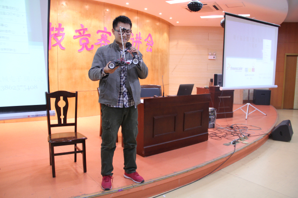 (管蕊、何鹭/文 陈灵光/图)2014年12月3日18:00,由我院科研竞赛服务中心举办的科技竞赛宣讲会在学生活动中心202室成功召开。本次大会由科研竞赛服务中心主任高志斌进行开场宣讲,来自2012级机械电子工程专业的飞思卡尔职能车竞赛获奖代表唐汉民、2013级计算机科学与技术专业ACM获奖代表濮元杰、艺术设计专业的戴雨人、文正智能车负责人陈冬蕾以及科电俱乐部副会长付文杰分别进行主题演讲。