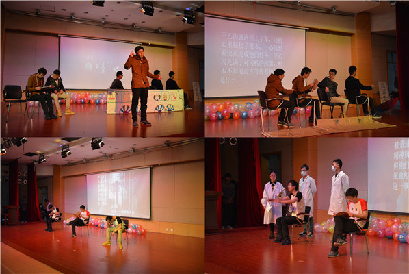 我院心理剧《飞跃疯人院》以预赛第一名的成绩进入决赛,该剧讲述的是甲乙丙三人因不慎搭乘了黑车,被误送到精神病院的故事。甲通过暴力抗争,乙通过据理力争的方式尝试证明自己心理健康,适得其反;丙却以理性而平和的方式,如愿离开精神病院,并解救了甲和乙。故事告诉我们:人际间的信任是通过理智来换取的,情绪用事往往难以如愿。