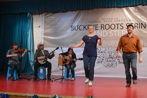 表演团取名于美国当地一种植物“Buckeye Roots Srings and Steps”(以下简称BRSAS),由小提琴手、吉他手、班卓琴手各一名以及两名舞蹈演员组成。演出在轻快的美国乡村音乐声中拉开序幕。略带沙哑的歌声伴随着轻扬的节奏,优美动听;动感的踢踏舞令现场掌声不断。随着“一二三”的节奏加快,在舞者的示意示范下,观众们跟随音乐一起舞动,台上台下化身为欢乐的海洋。五位表演者,不仅阐释了古老的“阿巴拉契亚”风格和当代美国音乐、舞蹈的内涵,更让观众们感受到了BRSAS乐队的热情和活力。据悉“BRSAS”乐团此次在北京、武汉、上海等地共进行六场汇演,苏州是他们此次中国行的第三站。