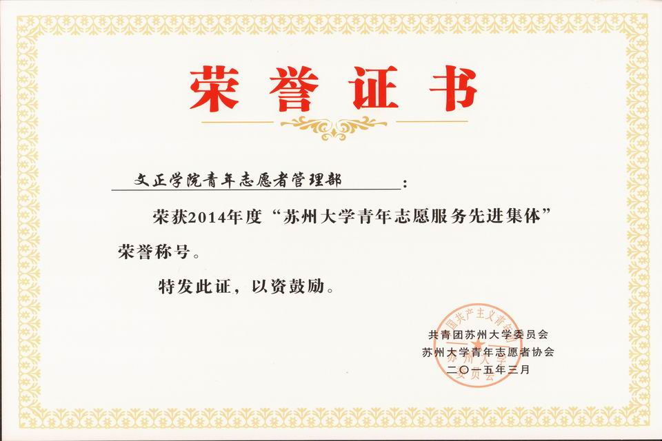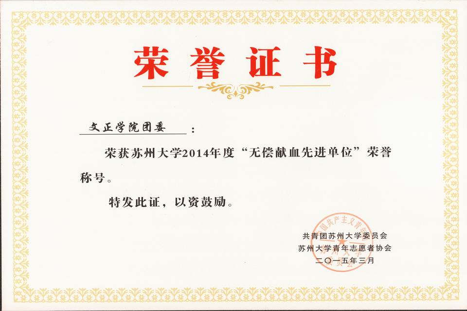 (王康/文)日前,在2014年度苏州大学青年志愿服务评比表彰中,我院团委被评为无偿献血先进单位,团委青年志愿者管理部(以下简称“青管部”)被评为苏州大学青年志愿服务先进集体,杨晨焱、何燕婷、刘香玉等35位同学荣获“苏州大学青年志愿服务先进个人”称号,袁艳荣获“无偿献血先进工作者”称号。