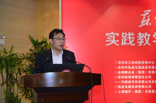 苏州市档案局文秘管理处处长、苏州市档案学会秘书长、苏州市工商档案管理中心主任卜鉴民作为实践教学基地代表发言。他表示高校和企事业单位作为人才资源的供需两端,合作共建实践教学基地对于双方而言都具有极其重要的战略意义。他认为实践教学基地应具有实践性、开放性、融合性的特征,在基地建设过程中应坚持以学生成长成才为中心、以应用技术培养为根本、以创新能力提升为驱动三大原则。