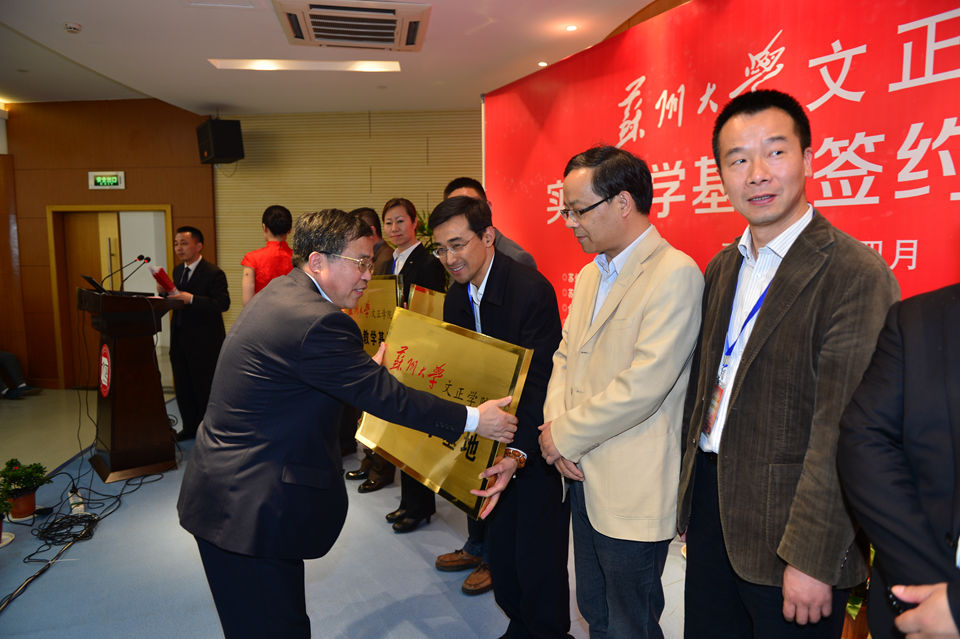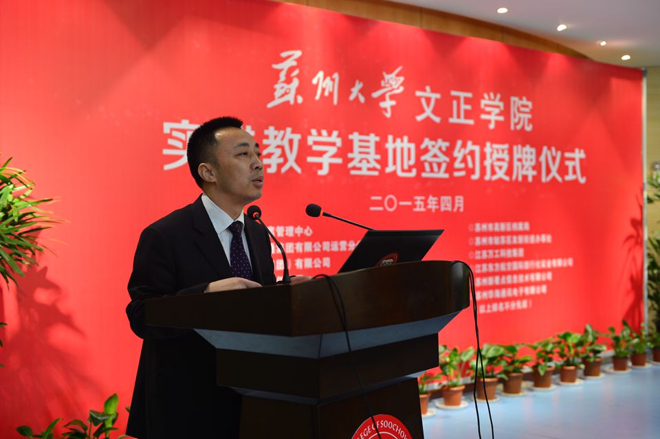 院长吴昌政致欢迎词。他指出文正学院创建伊始,就流淌着开放办学的血液,就有着校企合作的因子。今天的实践教学基地签约授牌仪式是学院办学理念的延续,更是开启校企合作新局面的开端。随着国家产业转型升级进程的加快,人才市场的供需关系正由高校为主导的供给驱动变为行业企业为主导的需求驱动。构建应用型本科人才培养体系,形成具有创新创意意识的人才培养特色是学院“十三五”及更长时间内的一项重要任务。