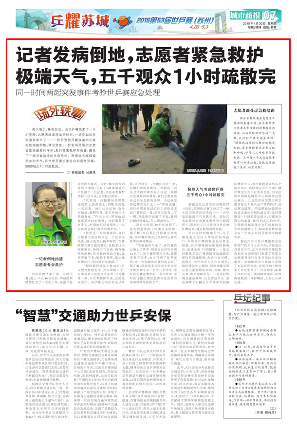 前天晚上,暴雨如注。当世乒赛结束了一天的赛程,志愿者准备搭车回校时,一场突如其来的意外发生了——一位负责世乒赛报道的记者突然抽搐倒地,情况危急,一位名叫邢丽的志愿者紧急施救和守护,及时等来救护车救援,避免了一场可能造成的生命危机。而面对当晚极端恶劣的天气,苏州世乒赛组委会启动紧急预案,5000观众1小时疏散完。