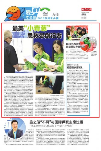 本报讯(图/文 记者 臧凌云 实习生 刘晴)4月28日深夜,一张“志愿者急救晕倒记者”的照片在世乒赛志愿者群组里流传。当本报记者昨天找到照片中的那位志愿者时,她却一直在强调,“我只是在等待救护车期间对晕倒的记者做了基本护理,做了志愿者该做的事,并没有像网上传的那么神。”这位志愿者的名字叫邢丽。