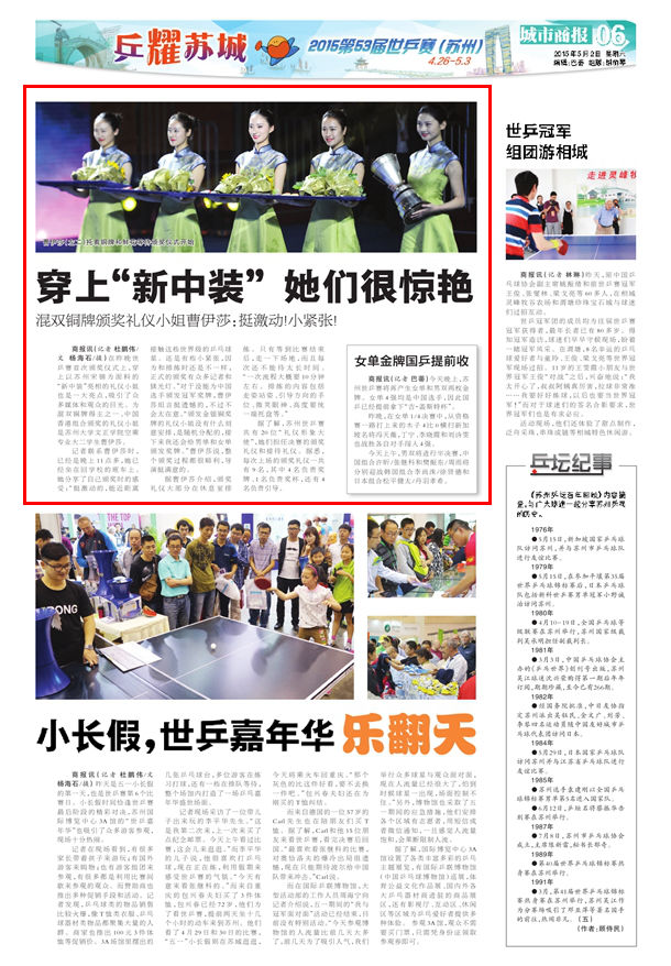 据了解,苏州世乒赛共有20位“礼仪形象大使”,她们担任决赛的颁奖礼仪和接待礼仪。据悉,每次上场的颁奖礼仪一共有9名,其中4名负责奖牌、1名负责奖杯,还有4名负责引导。