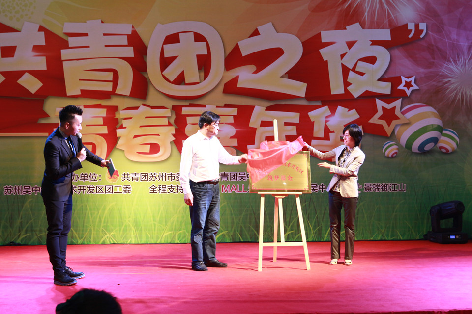 李兆玮和朱艳共同为苏州吴中经济技术开发区“筑梦”基金揭牌,此项基金是为了助力更多青年学子实现梦想。