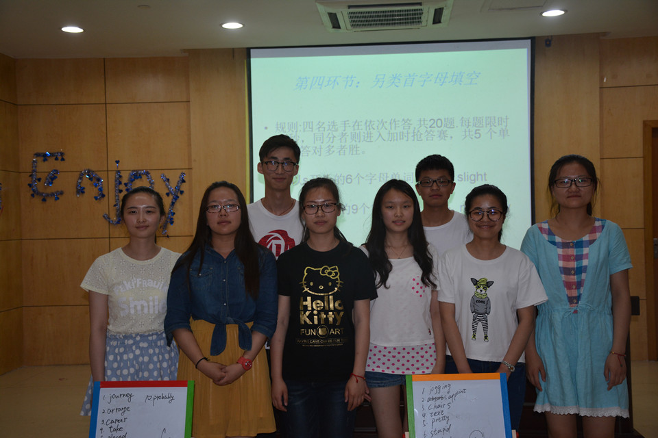 决赛分为四个环节,共有30名选手入围。第一个环节“巧手拼一拼”,20个混乱顺序的字母,3分钟的小组合作,8组的晋级名额,顿时点燃现场紧张的气氛。穿插在活动过程中的踩气球游戏,给比赛增添了欢声与笑语。选手实力旗鼓相当,第二个环节“谁笑到最后”和第三个环节“同义词、反义词大比拼”均出现了加时赛。第四个环节“另类首字母填空”将活动推向高潮,仅剩四名选手做最后的角逐,经过两轮常规时间比拼和一轮加时赛才告结束。