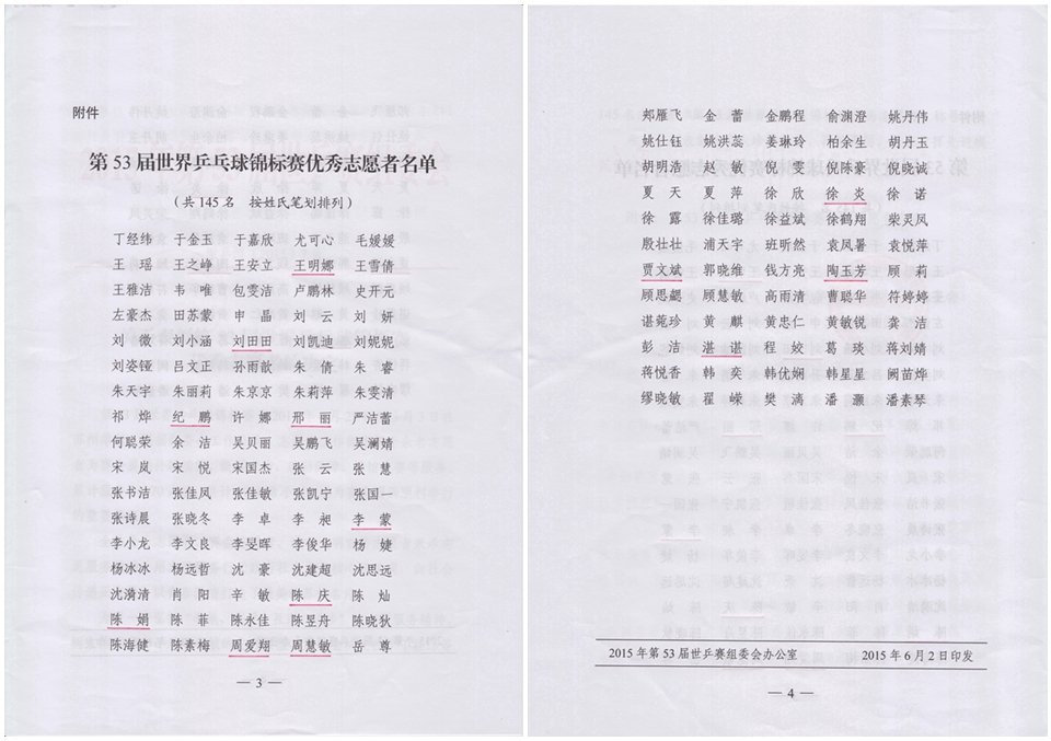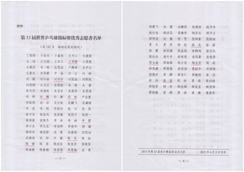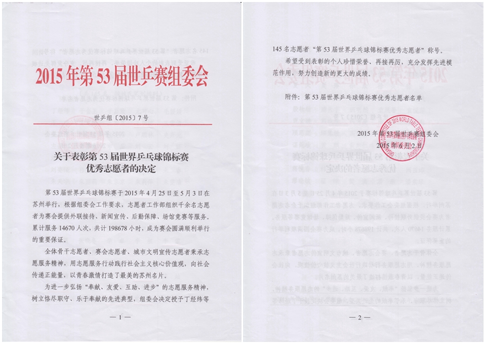 近日,第53届世乒赛组委会向我院发来“关于表彰第53届世界乒乓球锦标赛优秀志愿者的决定”,我院邢丽等13位世乒赛志愿者因表现突出,获得大赛组委会授予的“第53届世界乒乓球锦标赛优秀志愿者”称号。
