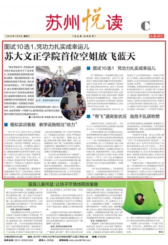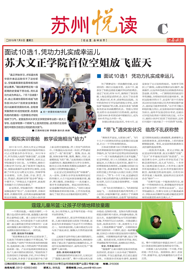 “真正开始学习,才知道光有华丽外表远远胜任不了这份职业,空姐最需要的是具有相当的职业素养。”明白离梦想还有一段距离的史雯暗下苦功后,凭扎实功力成为幸运儿。7月7日凌晨1点,由上海浦东国际机场起飞的东航MU5417航班安全降落在四川成都双流国际机场,全程微笑服务的90后空姐史雯,在送完机舱内的最后一位旅客后才轻松地呼了口气。史雯是苏州大学文正学院空乘专业的一名大三学生,也是学院第一个顺利飞上蓝天的空姐,这次航行正是她签约中国东方航空公司后的首次放飞。■ 江南时报记者 李晓静 通讯员 姚臻