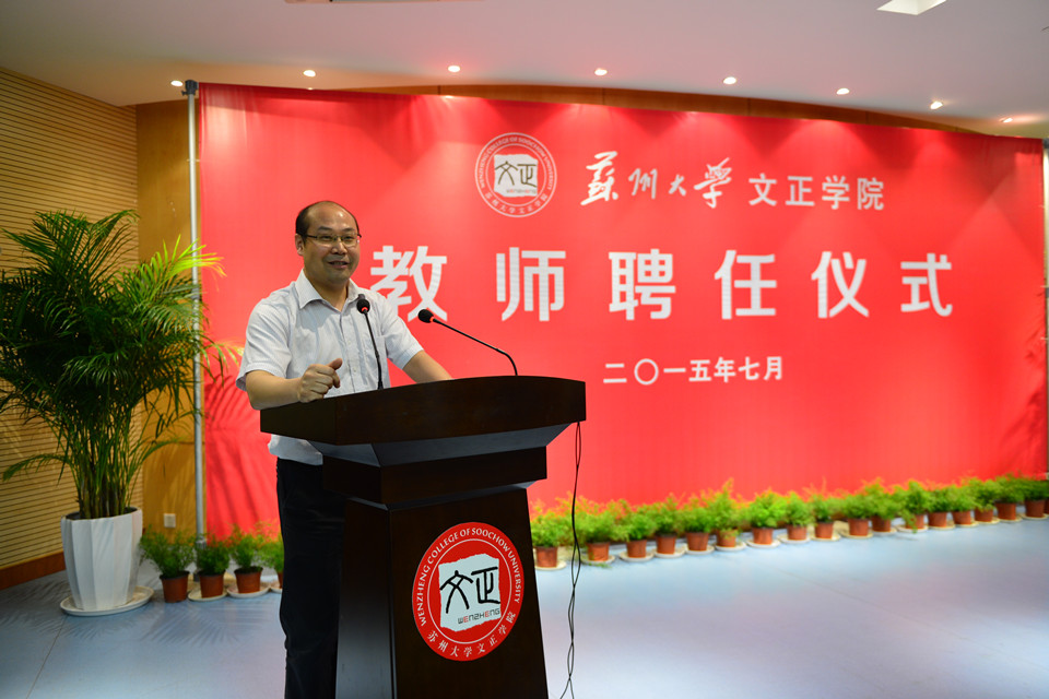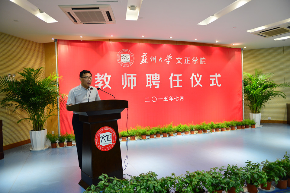 院长吴昌政致辞。他代表学院对母体苏州大学及职能部门、共建学院以及全体任课教师对文正学院长久以来的信任与支持表示衷心感谢。他总结了学院成立以来在体制机制、运行模式等方面形成的特色,指出自有师资队伍建设是学院今后发展历程中各类“问题”和“困难”破解所需依靠的最突出和最关键的因素。本次教师聘任仪式标志着学院自有师资队伍建设工作迈出的重要步伐。