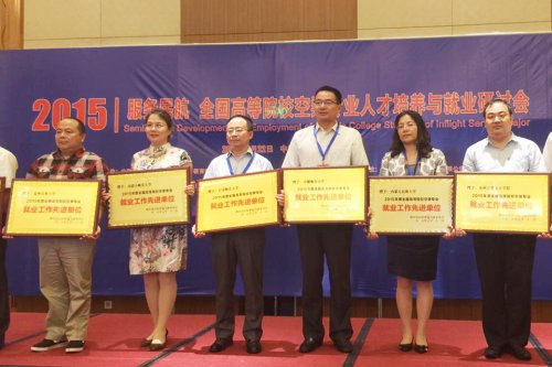 在推介会闭幕式期间召开的全国高等院校空乘专业人才培养与就业研讨会上,我院荣获“就业工作先进单位”称号,党委副书记仲宏代表学院上台领奖。