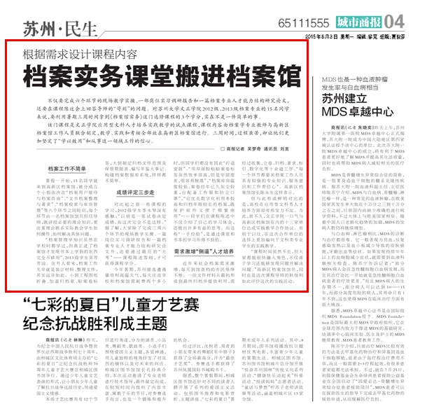8月3日,《城市商报》在A04版以“根据需求设计课程内容 档案实务课堂搬进档案馆”为题,报道了我院与苏州国家高新区档案馆合作开设《档案馆实务》课程实践教学的情况。以下为报道原文: