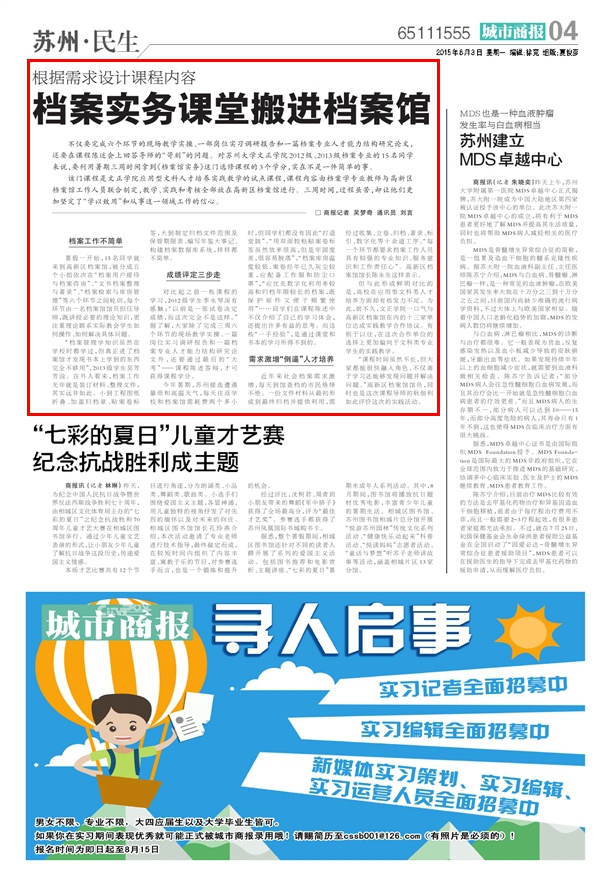 不仅要完成六个环节的现场教学实操、一部岗位实习调研报告和一篇档案专业人才能力结构研究论文,还要在课程陈述会上回答导师的“苛刻”的问题。对苏州大学文正学院2012级、2013级档案专业的15名同学来说,要利用暑期三周时间拿到《档案馆实务》这门选修课程的3个学分,实在不是一件简单的事。