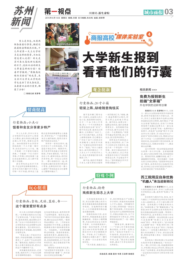 背上是书包,双肩两侧各挂着行李袋,胸前还抱着脸盆棉被热水瓶,十几年前第一天上大学时多是这样的情景,不知还有没有人记得?昨天是苏州各大高校新生报到的日子,这批95后的新生又带着怎样的行囊?趁着开学报到,“商报高校媒体实验室”的成员,来自苏州大学文正学院的学生走访了苏大各校区,来看看95后的行囊里,都装了点啥?