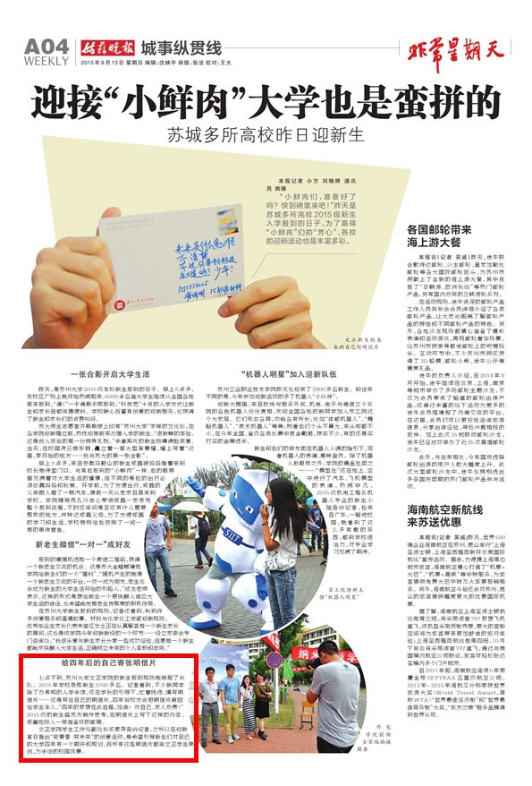 “小鲜肉们,准备好了吗?快到碗里来吧!”昨天是苏城多所高校2015级新生入学报到的日子,为了赢得“小鲜肉”们的“芳心”,各校的迎新活动也是丰富多彩。
