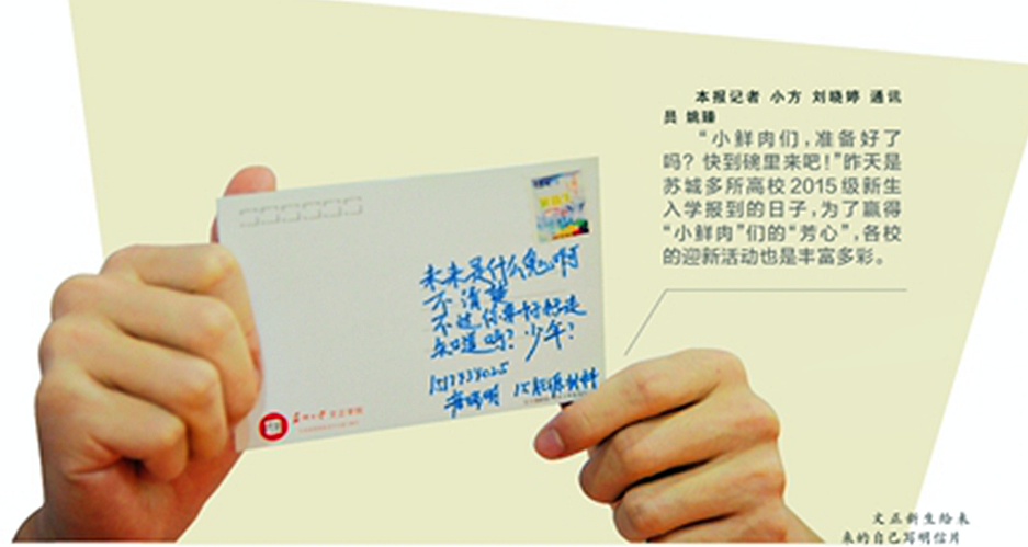 七点不到,苏州大学文正学院的新生报到现场就排起了长队。2015年学校录取新生2700多名。记者看到,不少新同学除了办常规的入学手续,还在学长的引导下,忙着挑选、填写明信片——这是写给自己的明信片,四年后校方会把明信片寄回给学生本人。“四年的梦想在此启程,加油!对自己、家人负责!”2015级的新生盛苏杰稍作思考,在明信片上写下这样的内容,郑重地投入一旁准备好的邮筒。