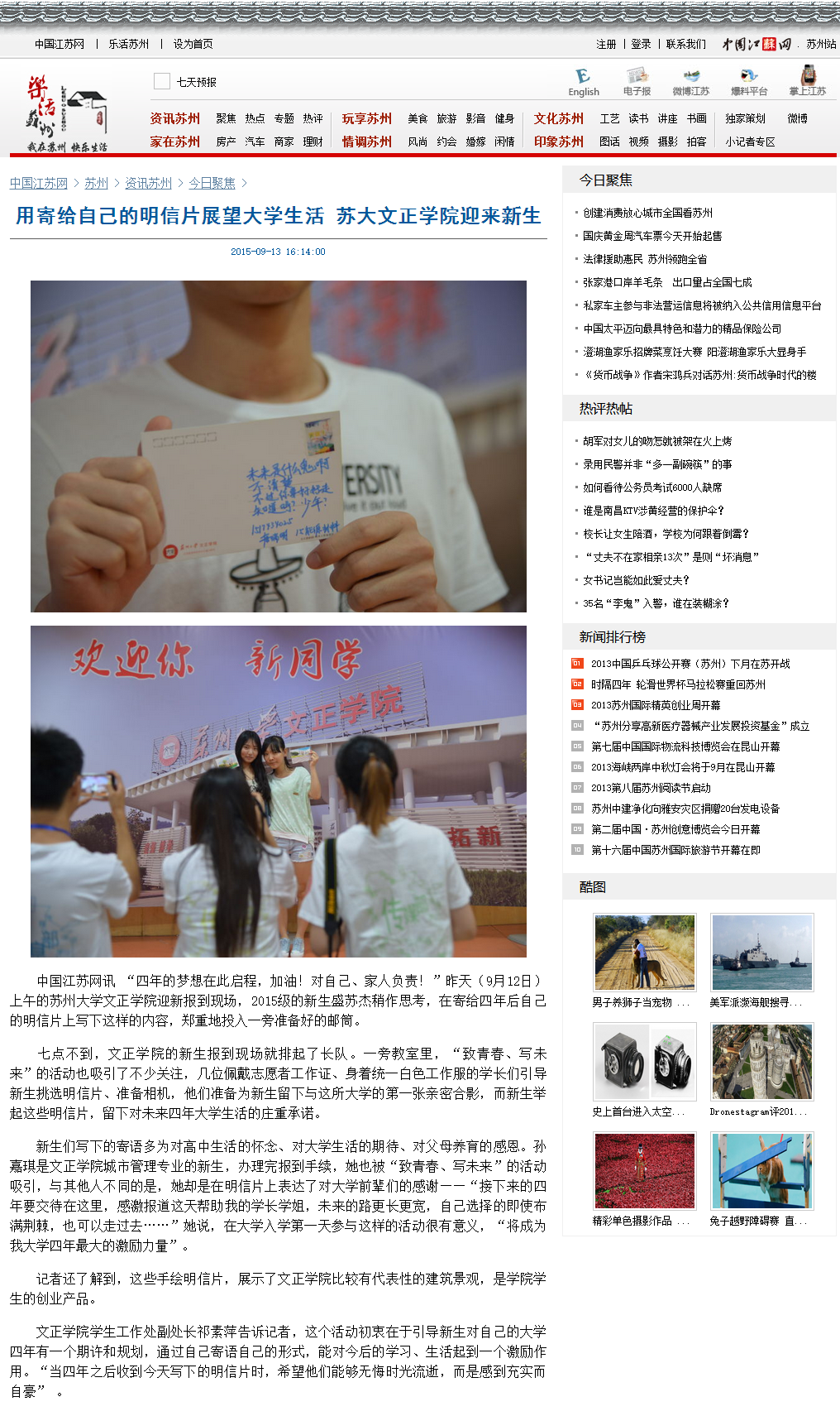 中国江苏网讯“四年的梦想在此启程,加油!对自己、家人负责!”昨天(9月12日)上午的苏州大学文正学院迎新报到现场,2015级的新生盛苏杰稍作思考,在寄给四年后自己的明信片上写下这样的内容,郑重地投入一旁准备好的邮筒。