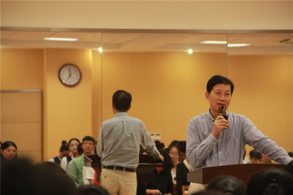 郭文介绍了近年来空乘专业的就业趋势,他希望同学们将来可以拥有选择就业的权利,选择有意义、有生活的工作。他说到,“当你的工作在你心中有意义,你就有成就感;当你的工作给你时间,不剥夺你的生活,你就有尊严。成就感和尊严,给你快乐。”