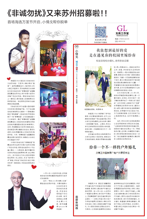 当天,苏州大学文正学院新闻中心主任邢超特地为两位校友证婚,“以前有很多同学回学校拍婚纱照,但回来办婚礼的还是头一对。”邢超告诉记者,这对新人申请回校办婚礼时,学校领导非常支持他们的这一决定,“他们俩都是对感情很认真的同学,也是我们优秀的校友。”