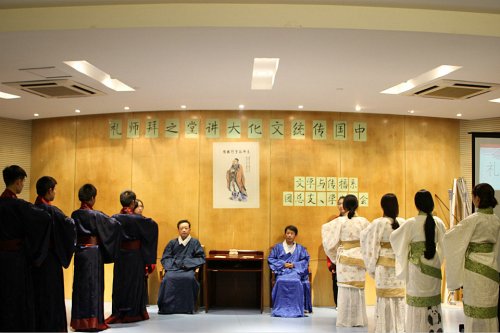 在一段介绍拜师礼的视频之后,拜师仪式正式开始。两位身着汉服的老师以及八位身着汉服的学子缓缓登台,师徒同拜孔子,老师入座,学生两侧行礼位就位,上香,奉茶。司仪宣读告文,“弟子”呈拜师帖,老师回帖,在场所有师生一起诵读《师说》。之后,弟子向老师奉送“六礼束脩”,即寓意谢师恩的肉干,业精于勤的芹菜,启窍生智的龙眼干,苦心教学的莲子,早日高中的红枣以及宏图大展的红豆。送完“六礼”,弟子对老师恭敬三拜谢师恩,聆听师训,礼成。