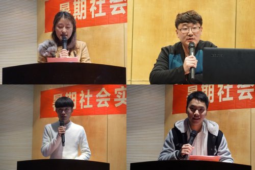 院级优秀调查报告获奖团队代表张鲁康和帅凯通过向大家展示实践活动的照片讲述了自己在社会实践过程中有趣的经历,带动了大会氛围。