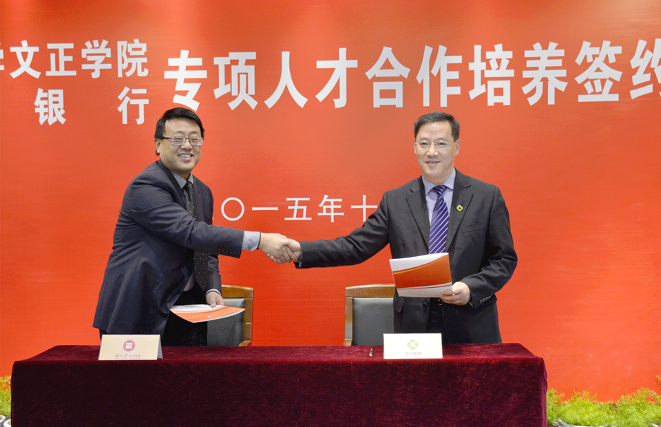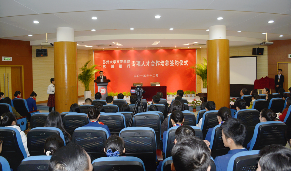12月15日上午,我院与苏州银行就专项人才培养签订合作协议。苏州银行行长徐挺、人力资源总监兼人力资源部总经理钱凌欣、人力资源部副总经理孙辉,我院院长吴昌政、副院长蒋峰、副院长袁昌兵等参加了签约仪式。签约仪式在学生活动中心举行,由袁昌兵主持。