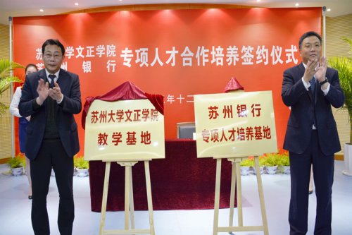 仪式上,钱凌欣和蒋峰分别代表苏州银行和文正学院在合作协议上签字并交换协议文本。徐挺和吴昌政共同为“苏州银行专项人才培养基地”和“苏州大学文正学院教学基地”揭牌。