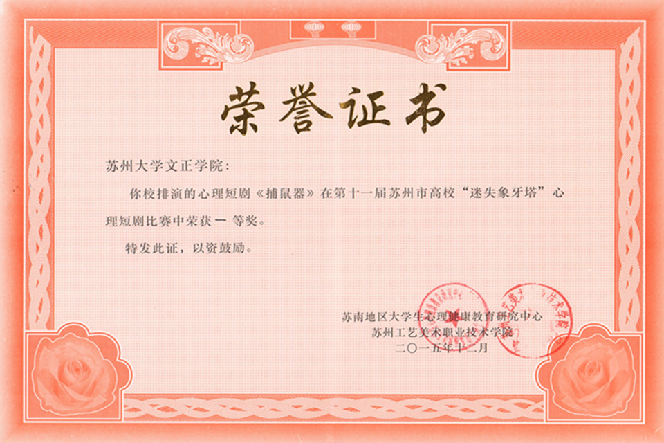 自去年12月份第十届苏州市高校“迷失象牙塔”心理短剧大赛中我院心理短剧《疯人院》首夺桂冠后,在今年3月份苏州大学第十届大学生校园心理剧大赛、5月份苏南地区高校大学生校园心理情景剧大赛、7月份苏州国际教育园心理剧本大赛中我院又连夺“三冠”。至此,我院已经获得苏南地区高校各级各类心理剧比赛的大满贯。