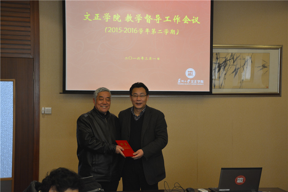 施盛威介绍了本学期新聘教学督导组成员徐文华,并由院长吴昌政为其颁发聘书。她充分肯定了教学督导组的工作成效,感谢督导组成员长期以来对学院教学工作付出的辛苦努力,对教学督导工作的革新举措给予了较高评价,希望教学督导组继续贯彻落实学院整体工作指导方向,不断完善督导工作机制,保障学院教学质量与教学水平,助力学院向一流独立学院的目标迈进。