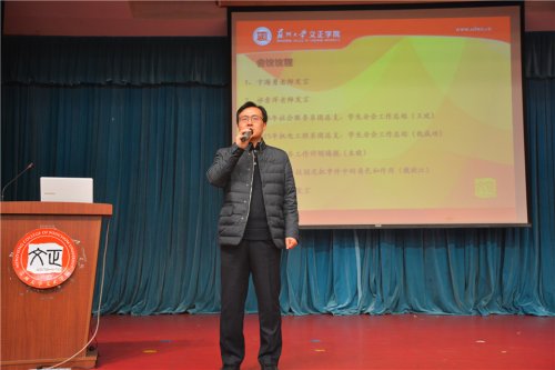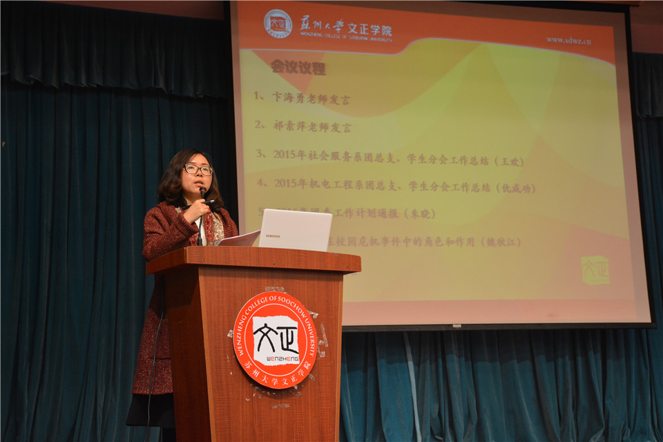 社会服务系和机电工程系团总支、学生分会负责人王欢、仇成功做2015年度系科工作报告,详细地叙述一年来系科与班级工作对接的方方面面。团委负责人朱晓就2016年团委工作计划进行解读,新学期团委将持续推进全院团员青年思想教育以及能力培养工作。