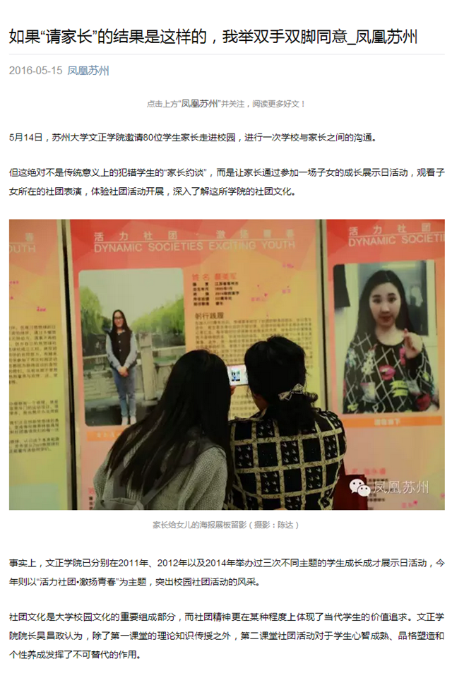 5月14日,苏州大学文正学院邀请80位学生家长走进校园,进行一次学校与家长之间的沟通。