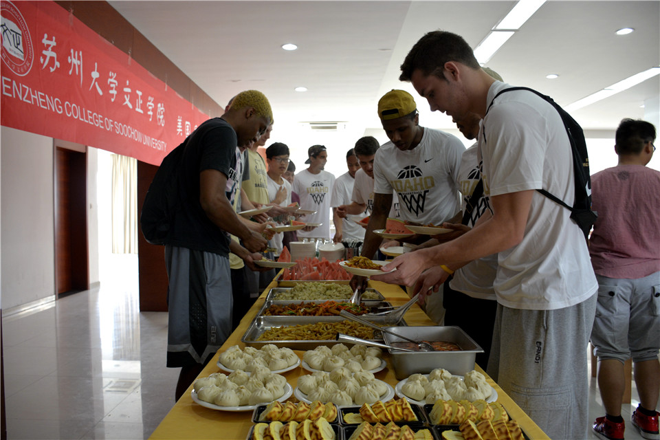 当天中午时分,爱达荷大学一行来到我院。食堂为远道而来的客人精心准备了小笼包、春卷、扬州炒饭等具有中国特色的美食,这让美国队员喜出望外。照顾到有队员不能适应中国食物,食堂还特地安排了薯条、芝士糕点等内容丰富的西点。