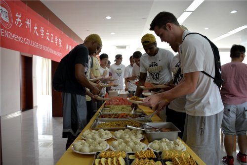 6月13日,代表美国前来参加“江南嘉捷杯”2016国际男篮挑战赛的爱达荷大学篮球队到访我院。他们在这里不仅品尝到了具有中国特色的精美小吃,还“技痒难当”与我院学生进行了即兴的篮球对抗,为即将到来的大赛轻松备战。