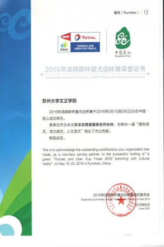 2016年道达尔·汤姆斯杯暨尤伯杯赛志愿服务合作伙伴荣誉证书