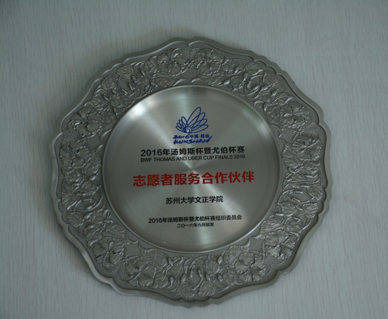 2016年道达尔·汤姆斯杯暨尤伯杯赛志愿服务合作伙伴荣誉牌匾