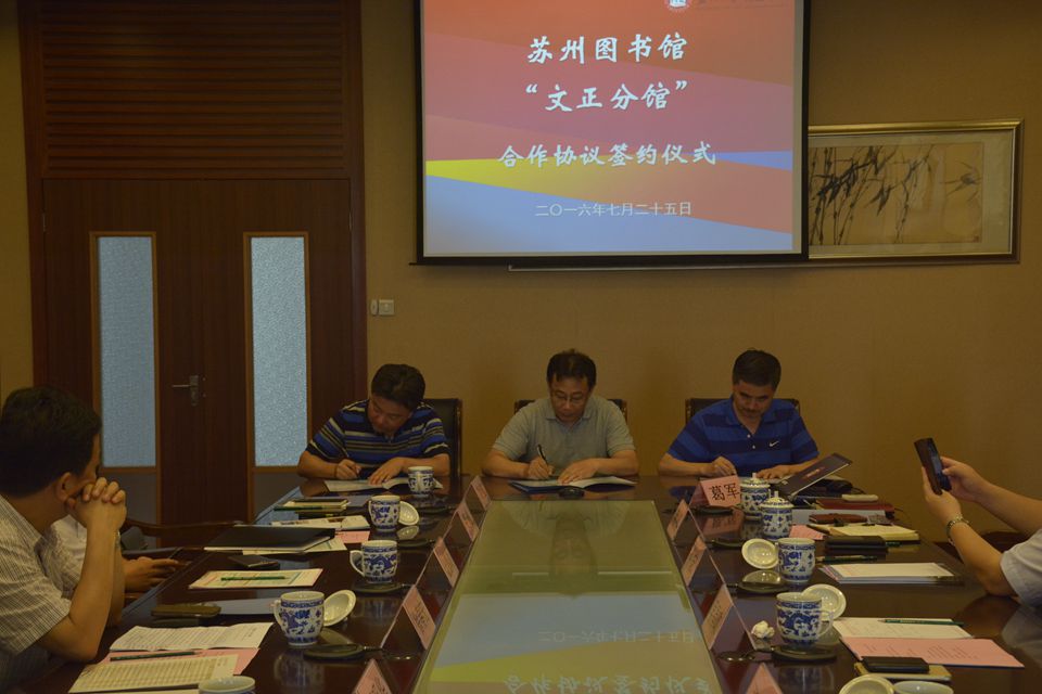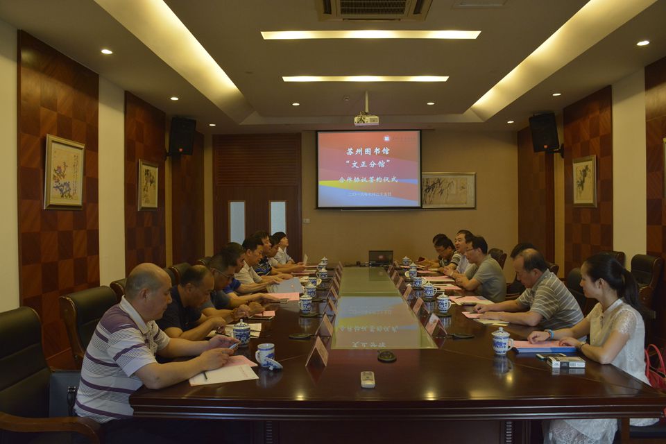 7月25日下午,我院与苏州图书馆、苏州市新华书店有限责任公司就共同建设苏州图书馆“文正分馆”达成合作意向,签约仪式在学生活动中心204室举行。苏州市文化广电新闻出版局副局长徐春宏、苏州图书馆馆长金德政、馆长助理费巍、苏州新华书店有限责任公司董事长邓明华、总经理沈菊芃等一行八人参加仪式,我院院长吴昌政、党委书记仲宏、副院长施盛威、副院长蒋峰及相关部门负责人出席,仪式由图书馆馆长张宏成主持。