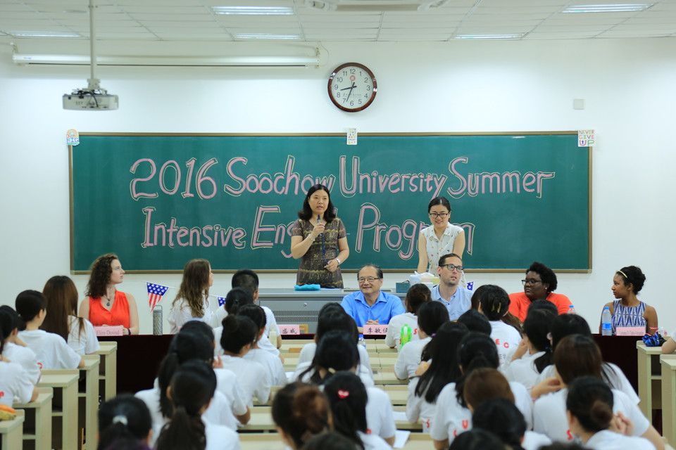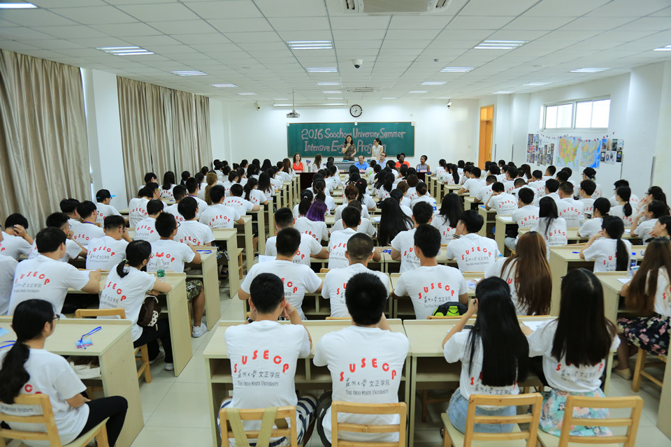 8月1日上午,由我院与美国俄亥俄州立大学共同开设的第二期暑期英语口语强化班开班典礼在教学楼4-306教室举行。俄亥俄州立大学教授团队领队李敏儒,我院副院长施盛威、国际合作交流处处长唐凤珍等出席了本次开班典礼。