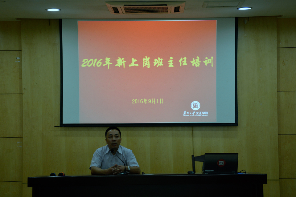 2016年9月1日,苏州大学文正学院新上岗班主任培训在学生活动中心106顺利举行。我院党委副书记、副院长袁昌兵以及相关部门负责领导出席并担任各模块培训嘉宾,一共31名新上岗班主任参加了本次培训,培训由学生工作处处长卞海勇主持。