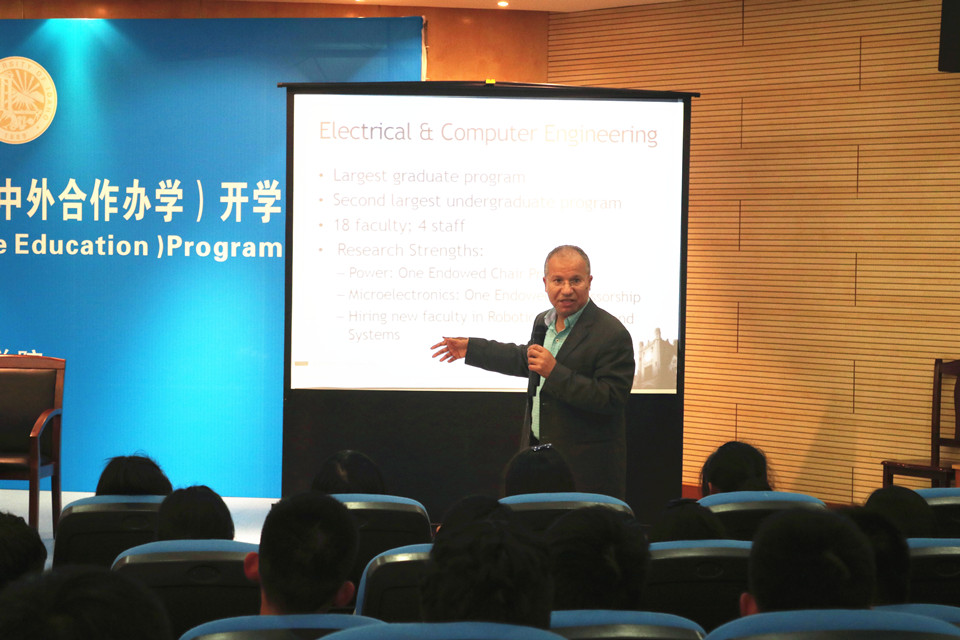 10月11日下午,我院2016级电气工程及其自动化(中外合作办学)专业开学典礼在学生活动中心201举行,美国爱达荷大学工程学院院长Larry Stauffer和电气系主任Mohsen Guizani,我院院长吴昌政、副院长施盛威出席典礼。一同参加的还有我院国际合作交流处处长唐凤珍和苏州大学物理科学与技术学院教师曹海霞等。