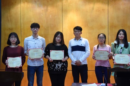 随后冯超老师给上届帮扶之星颁发荣誉证书并合影留念。14英语专业盛欣煜作为上届优秀帮扶代表出席本次交流会,并上台分享自己的帮扶心得,同时向学习有困难的同学提供了自己的学习经验。他建议帮扶工作应该因人而异,根据被帮扶者所欠缺的方面进行帮扶,在时间不充裕的情况下注重核心知识点的学习。
