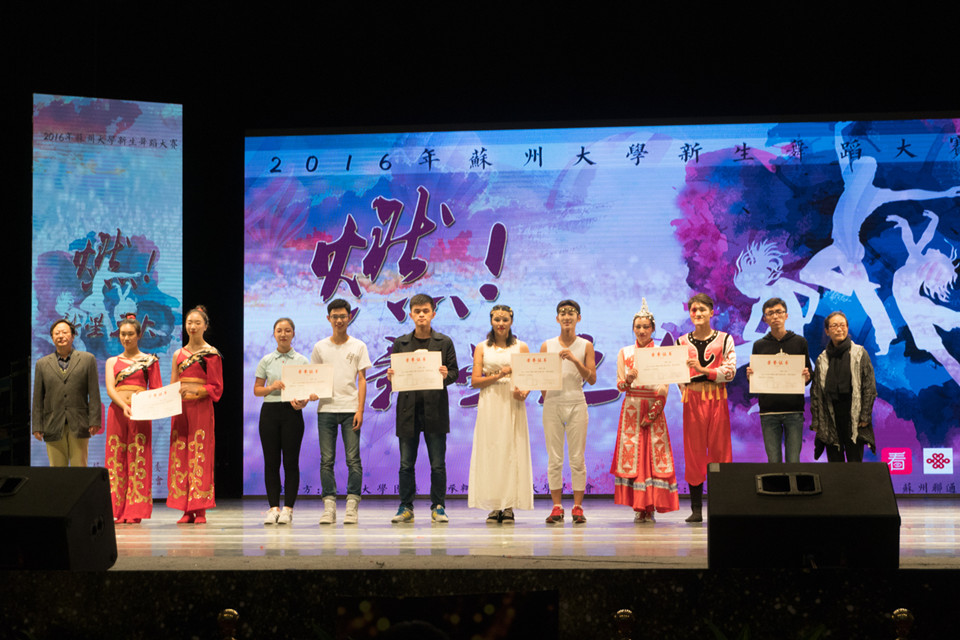 (罗欣月邹量/文、殷豪杰/图)10月30日晚6点,由共青团苏州大学委员会、苏州大学学生会、苏州广电看苏州媒体和苏州联通联合主办的苏州大学2016年新生舞蹈大赛在独墅湖影剧院拉开帷幕。莅临本次舞蹈大赛的嘉宾有苏州大学党委副书记、副校长江作军,苏州大学团委书记肖甫青,苏州大学团委副书记孙磊,此外还有各学院领导和老师们,各大校级组织代表及学院学生代表。我院艺术团指导老师冯超与同学们一起观看比赛,经过激烈的角逐,我院不负众望,再获佳绩,荣膺优胜奖。