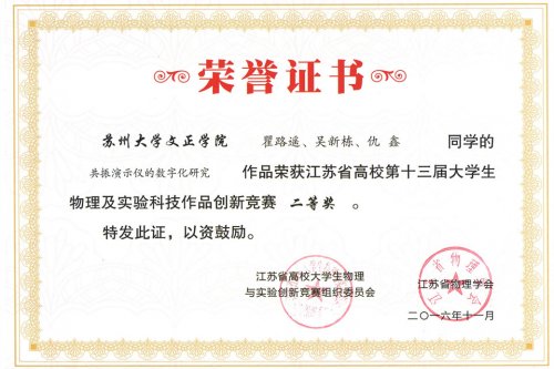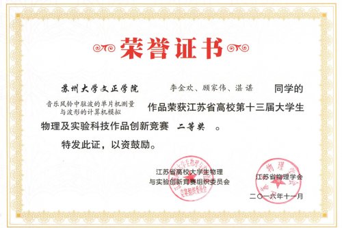 江苏省高校大学生物理及实验科技作品创新竞赛每年举办一届,本届竞赛全省共有包括南京大学、南京航空航天大学、苏州大学等知名高校在内49所高校递交了321项参赛作品。经复审,239项作品入围决赛,其中实验作品类174项,论文类65项。我院递交的三项实验作品全部入围决赛,在最终评选中分获实验作品类第23、24、25名,全部荣获二等奖。