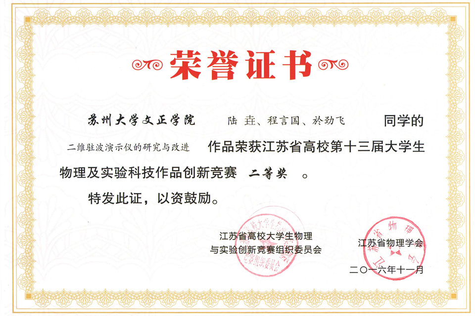 二维驻波演示仪的研究与改进 | 陆 垚、程国言、於劲飞 | 钱 铮、李成金 | 二等奖 |