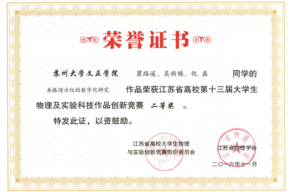 共振演示仪的数字化研究 | 瞿路遥、吴新栋、仇 鑫 | 吴 丹、邱国平 | 二等奖 |