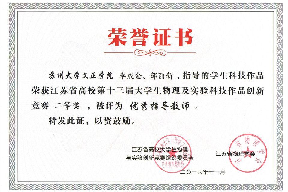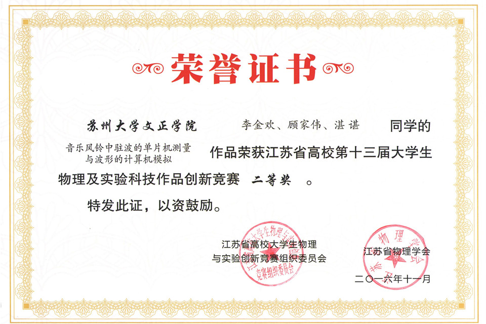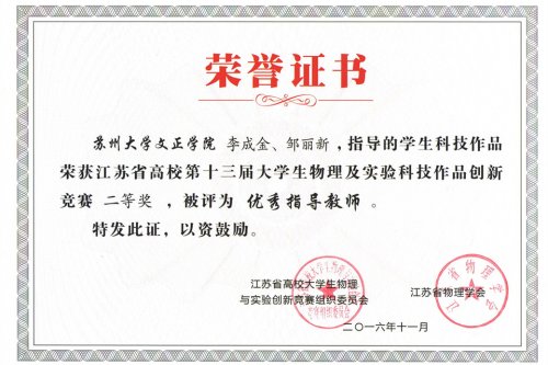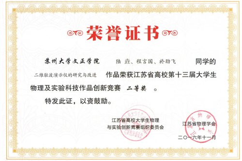 江苏省高校大学生物理及实验科技作品创新竞赛每年举办一届,本届竞赛全省共有包括南京大学、南京航空航天大学、苏州大学等知名高校在内49所高校递交了321项参赛作品。经复审,239项作品入围决赛,其中实验作品类174项,论文类65项。我院递交的三项实验作品全部入围决赛,在最终评选中分获实验作品类第23、24、25名,全部荣获二等奖。